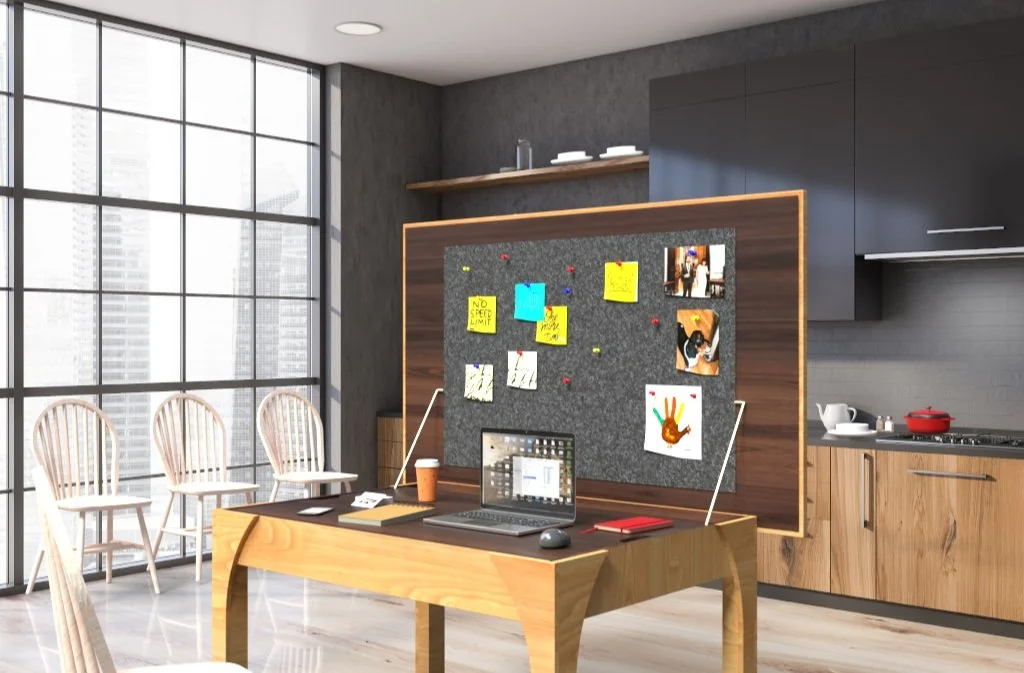Selected images of sketches and early prototypes are displayed in large format on the wall to take advantage of this circulation and provide a window into the design process. At the same time, a looping demo video plays overhead, illustrating the features and operation of the piece while drawing the attention of festival attendees. The desk is furnished with an assortment of functional home office tools and a full-size mock laptop, encouraging visitors to stop and interact with the piece as if they were in their own homes.