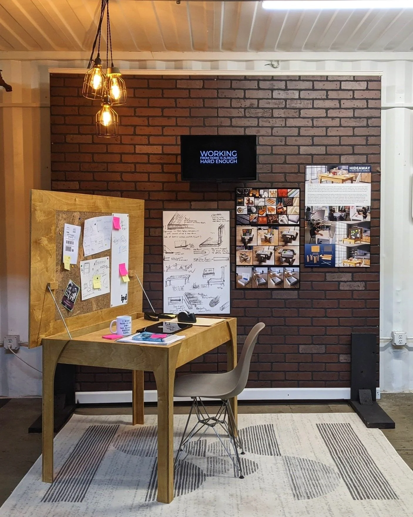 The concept behind the Hideaway installation was simple: create a context in which visitors can experience the piece firsthand. I used a freestanding wall panel, area rug, and industrial-chic light fixture to evoke the feeling of a modern urban apartment while subtly indicating the borders of the designated exhibition space without the claustrophobic confines of walls or other physical barriers. This encouraged visitors to circulate through the area and better visualize how a piece like this might integrate into their home lives.