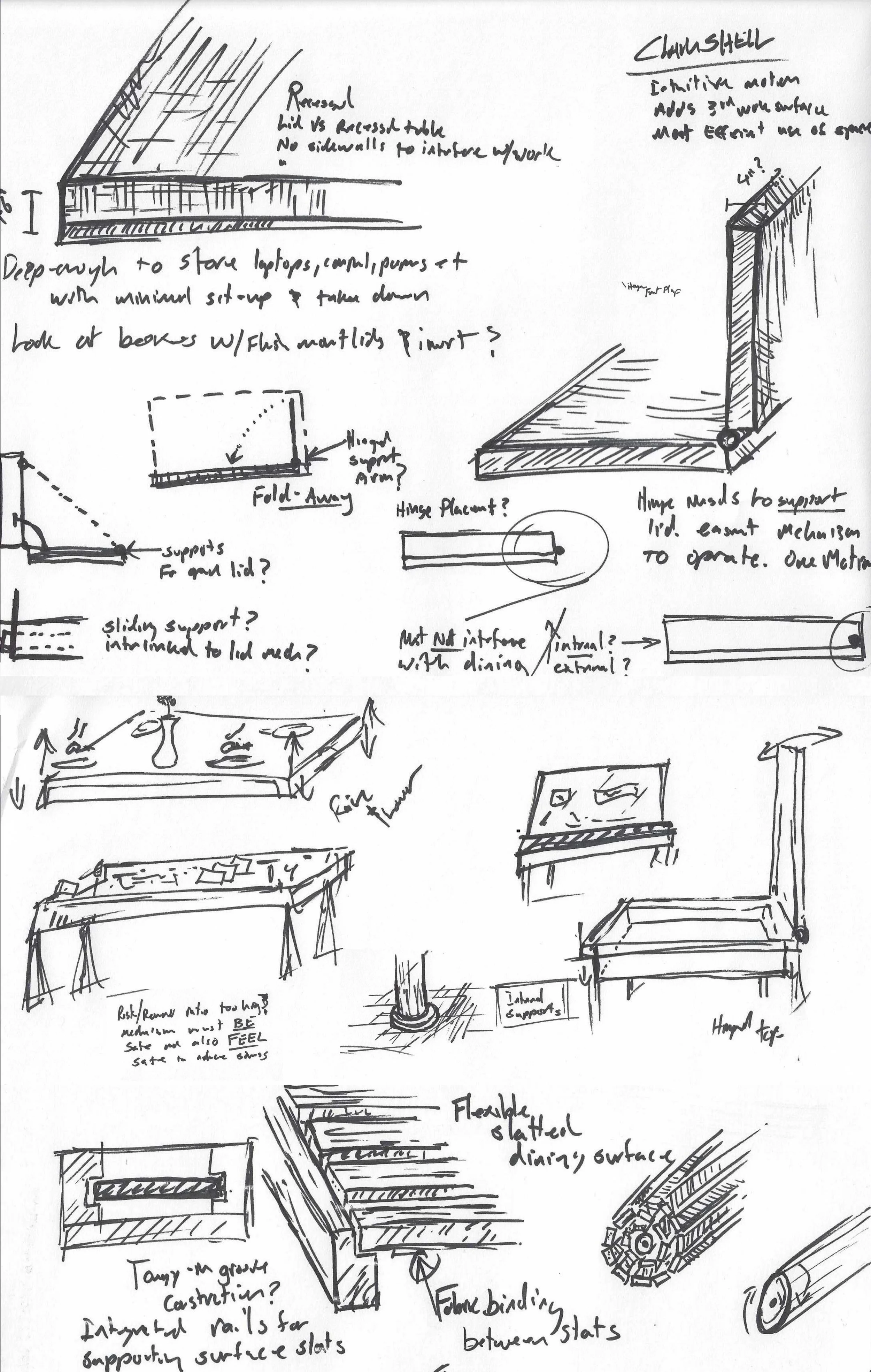 A variety of 2d and 3d sketching techniques were used to develop a simple and effective mechanism capable of transitioning modes with minimal preparation and storing work materials in a secure and discrete manor.