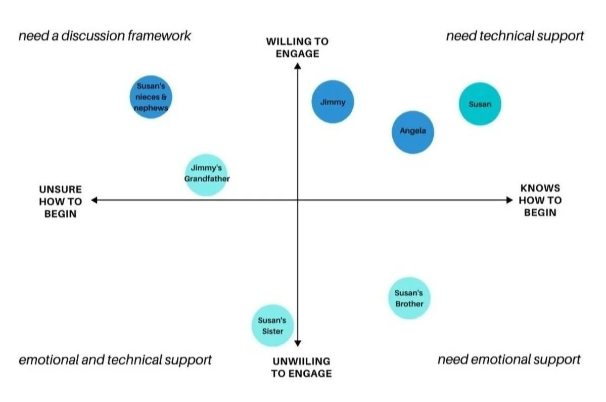 We developed this mapping of family members’ willingness and ability to engage in conversations about their experiences. This process helped us to better the existing barriers that we might address and how to empower members of the younger generations to begin and navigate these conversations.